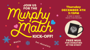 Join us after school on Thursday, December 4 for the Murphy Match Kickoff Event! Enjoy free hot chocolate for everyone and receive a free Murphy mug with any donation.
